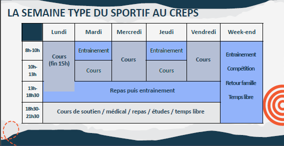 • un rythme de vie dense, réglé par les entraînements, le travail scolaire et personnel, la récupération, les stages et les compétitions.